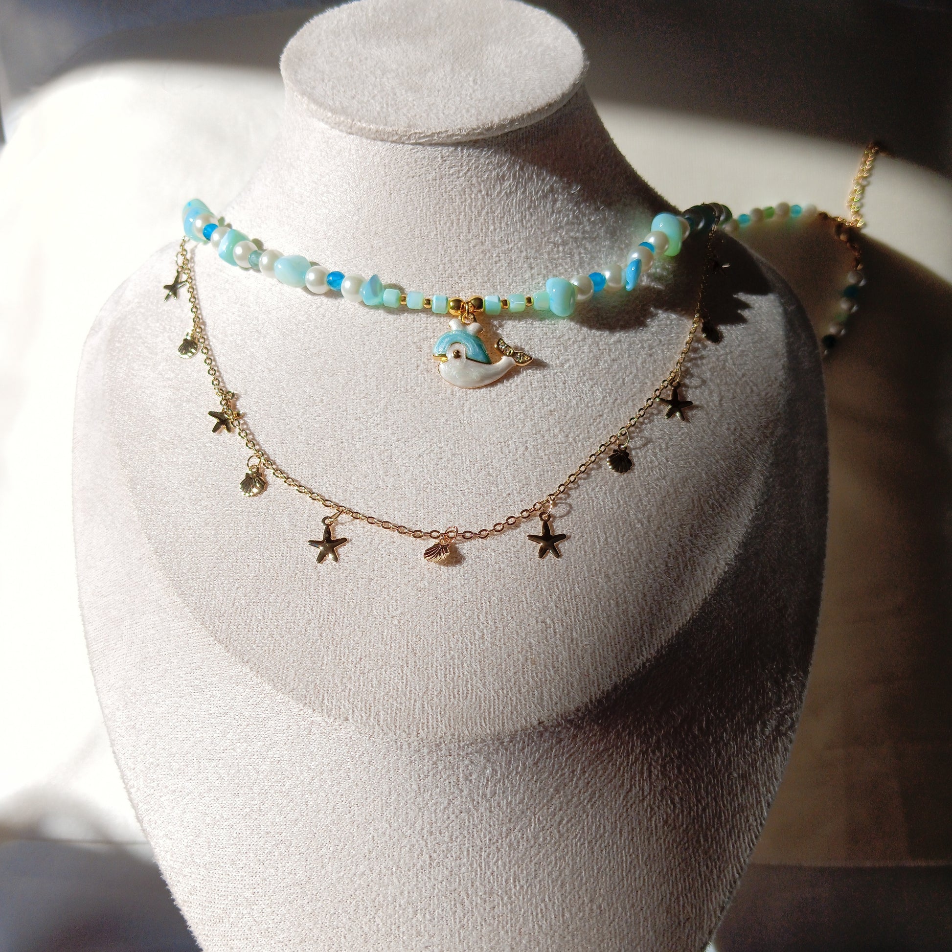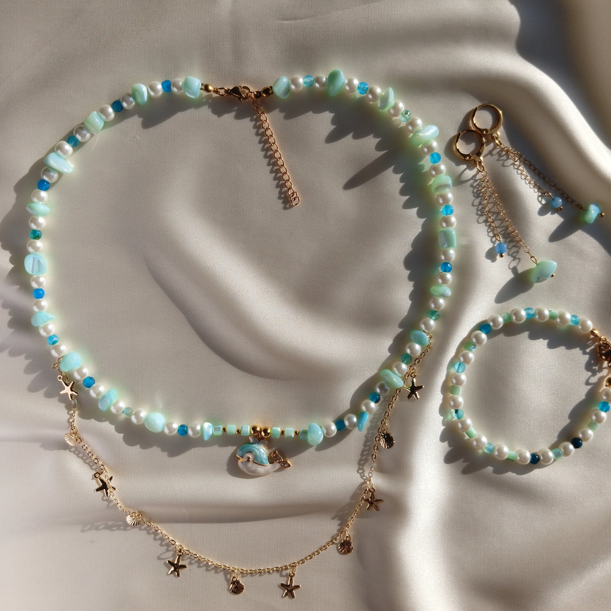 Materials: Blue Agate, Natural shells, Glass Pearl, natural stones, gold plated, and High-quality stainless steel.