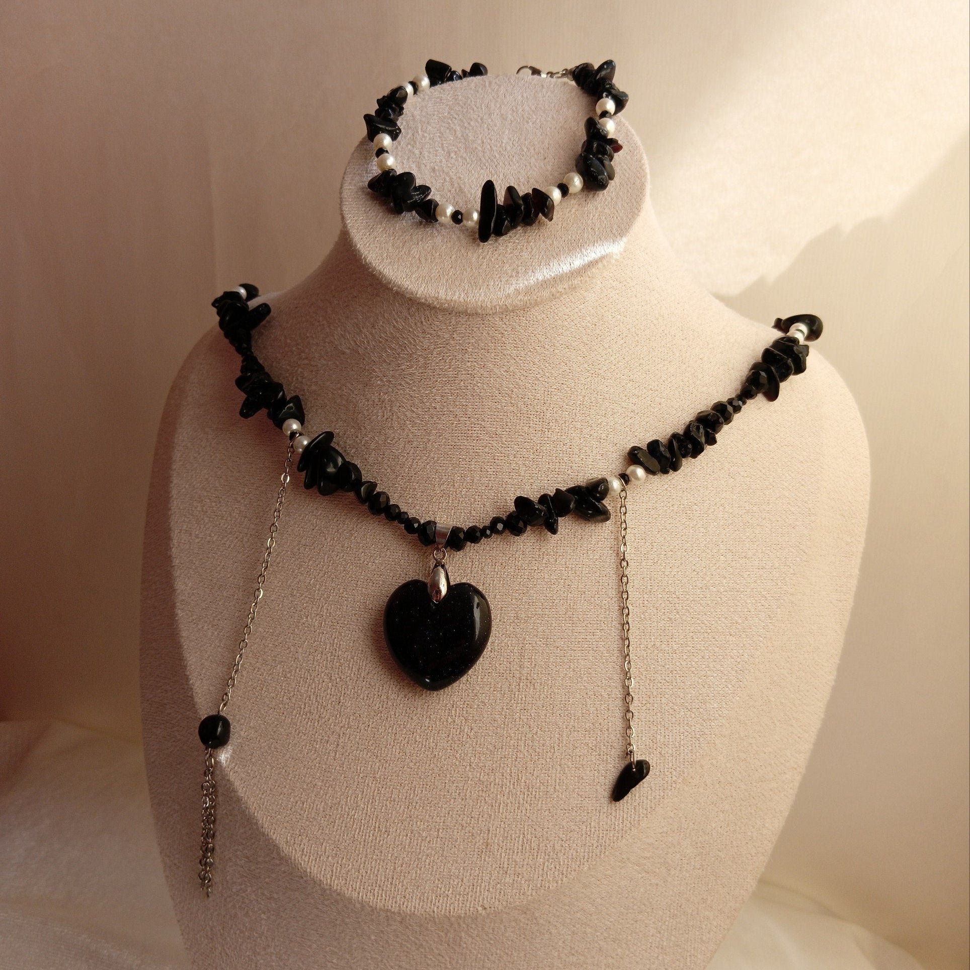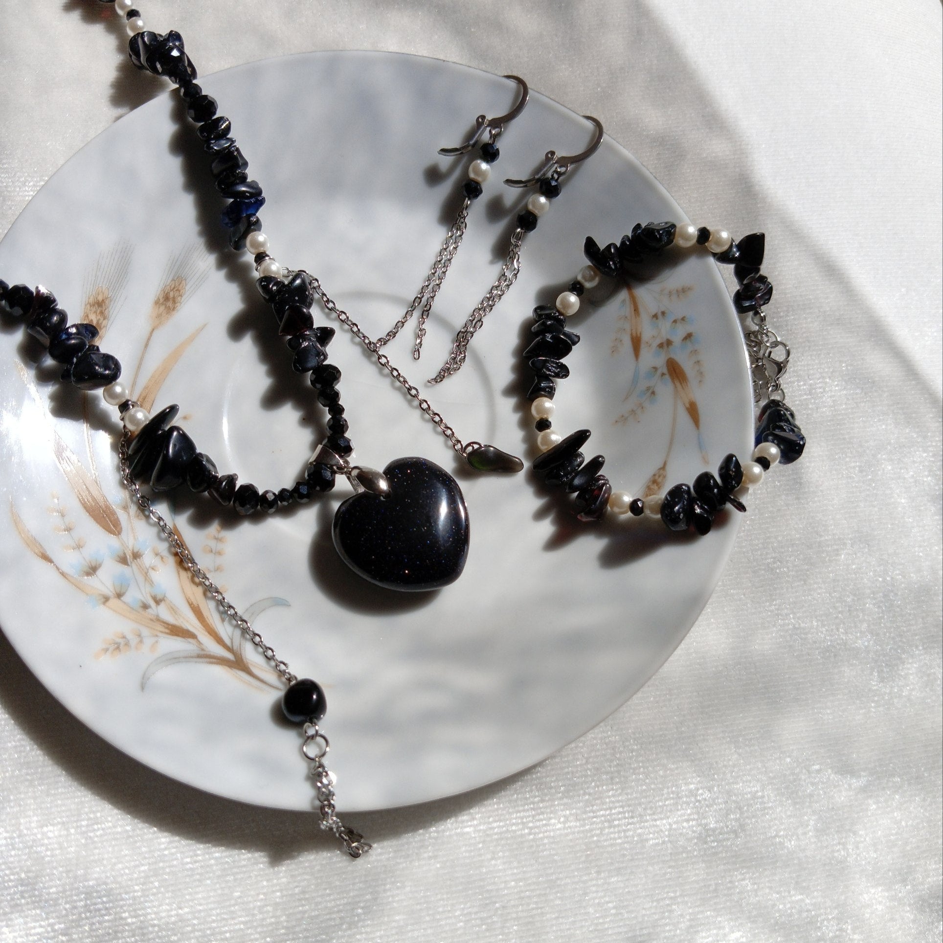 Materials: Blue Goldstone, High-quality stainless steel, natural stones, natural pearls, and Crystal.