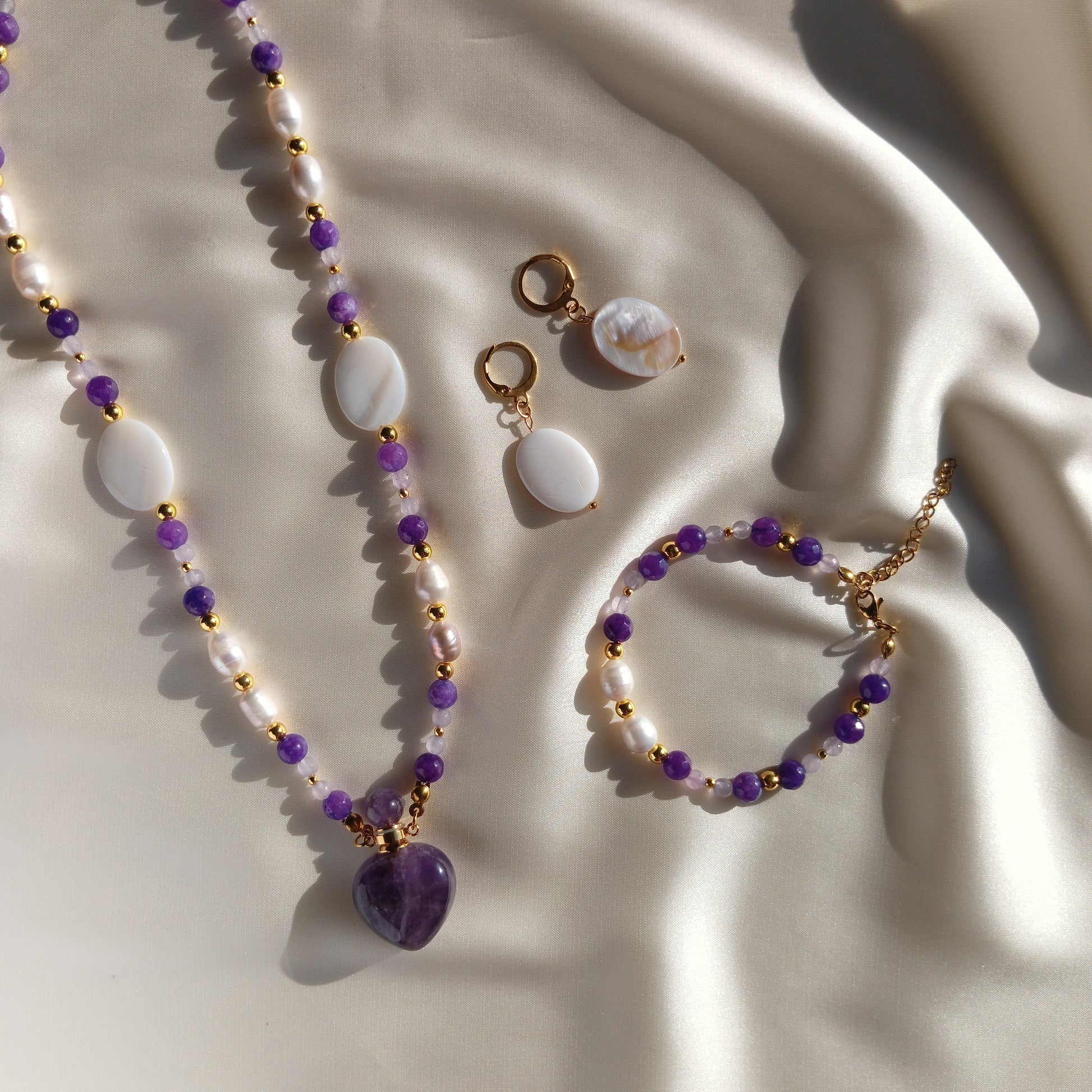Materials: Purple Agate, Amethyst, Natural Pearls, Natural shells, Hematite, High-quality stainless steel.